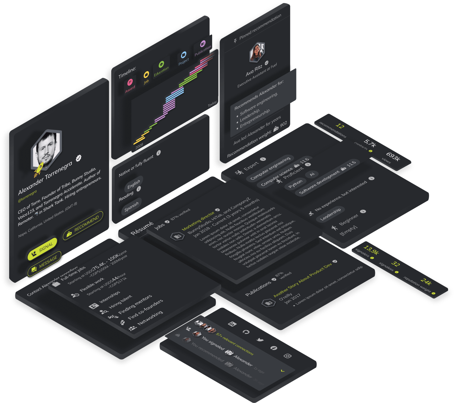 Los currículos no son suficientes. Los genomas profesionales incluyen miles de puntos de datos tales como experiencia, habilidades técnicas y blandas, preferencias, intereses y desintereses, psicometría, comportamiento profesional, autoconocimiento, velocidad y capacidades de aprendizaje, redes de contacto, verificaciones de referencias, recomendaciones, certificaciones y más